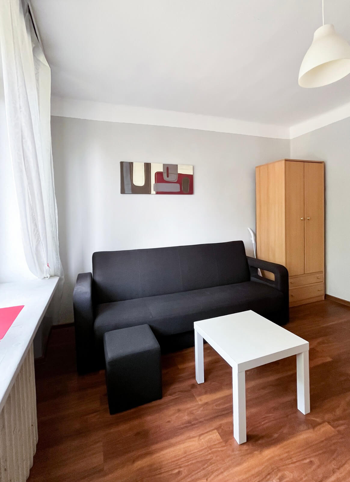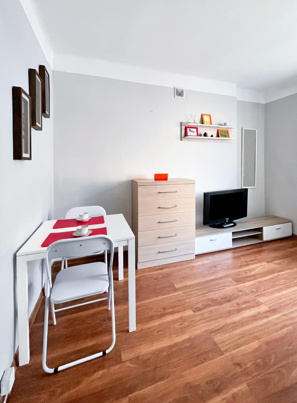 - Pokój (narożnik, stół, krzesła, dywan, stolik kawowy, szafka rtv) z aneksem kuchennym (lodówka, płyta grzewcza, piekarnik, zmywarka)